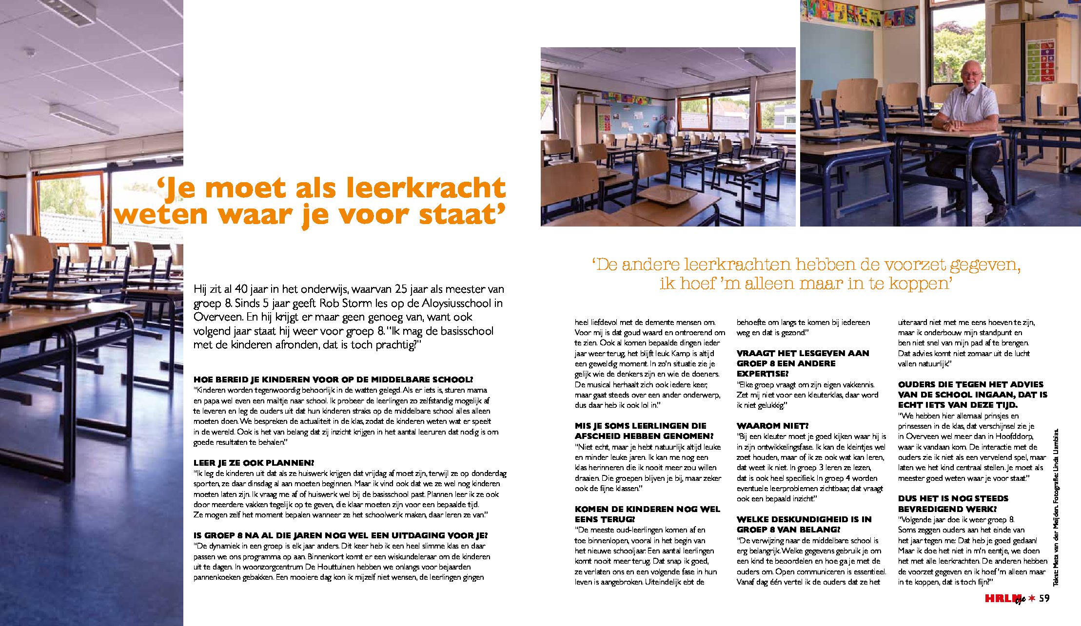 Hij zit al 40 jaar in het onderwijs waarvan 25 jaar als meester van groep 8. Rob Storm probeert zijn leerlingen zo zelfstandig mogelijk af te leveren en vertelt hen dat ze straks alles alleen moeten doen op de middelbare school. Tijdens een interview met TEXTSTUDIO voor HRLMtje, een tijdschrift voor kinderen en ouders, deelt hij zijn ervaringen. “Het is van belang dat leerlingen inzicht krijgen in het aantal leeruren, dat nodig is om goede resultaten te behalen en dat ze leren plannen. Groep 8 is nog steeds een uitdaging voor mij. De dynamiek in een groep is elk jaar anders.”