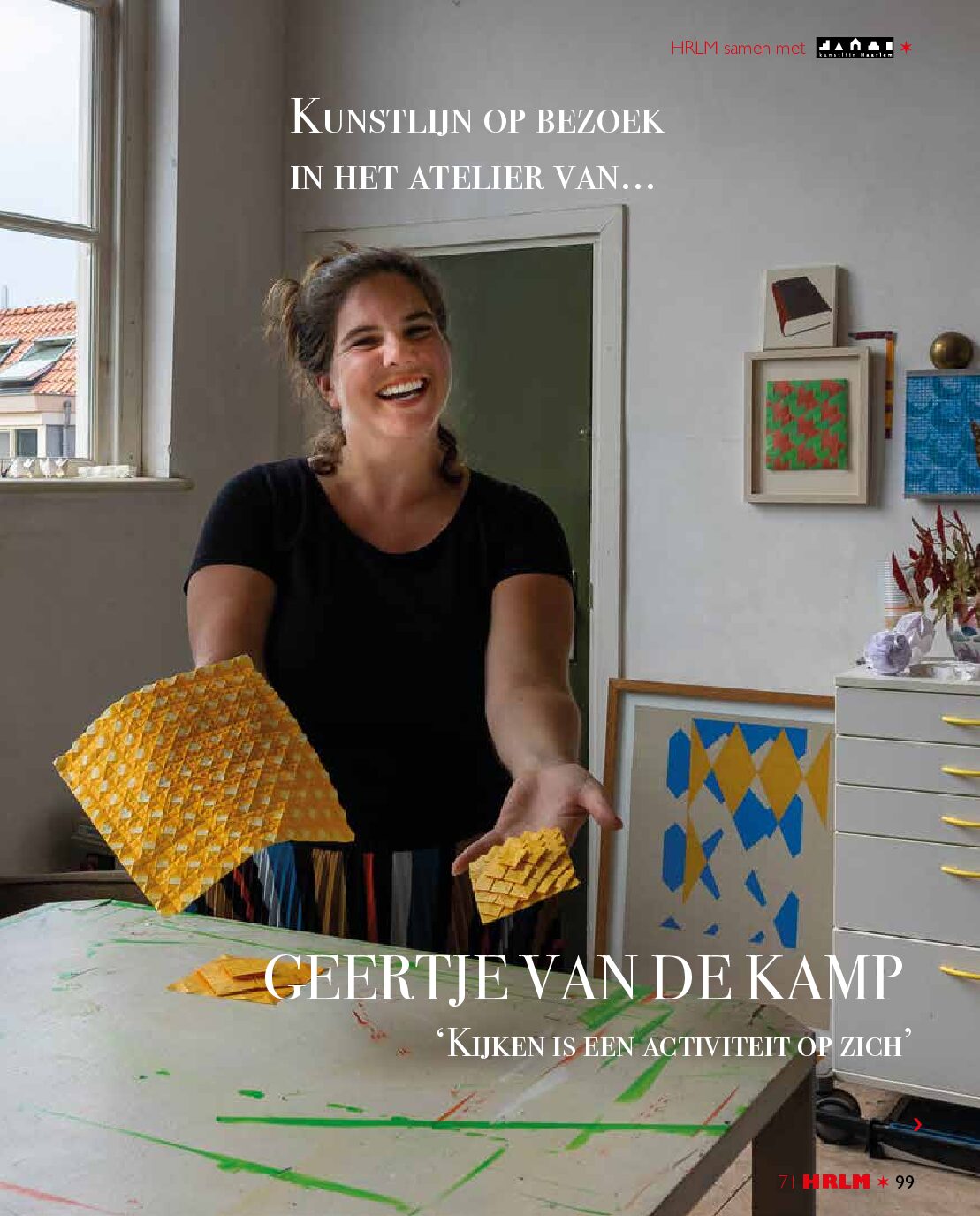 De schilderijen op acrylglas van Geertje van de Kamp gaan over waarnemen, over hoe onze hersenen interpreteren wat ze te zien krijgen. “Waar kijk je naar en wat valt jou op? Dat interesseert me. Kijken is een activiteit op zich.” Scherpe hoeken, felle kleuren, schaduw en spiegeling. Plat versus diepte. De kunstenaar is gefascineerd door gevouwen papier: van simpel vlechtwerk tot wiskundig origami. Ze won dit jaar de Van Vlissingen Art Foundation prijs, die maakte het voor haar mogelijk naar Japan te reizen om inspiratie op te doen. “Ik wilde kijken hoe origami daar beleefd wordt. Het winnen van de prijs gaf me een enorme boost.” TEXTSTUDIO sprak met haar voor de HRLM Haarlemse Stadsglossy. Van haar nieuwe werk is een boek verschenen, geschreven door kunstcriticus Maarten Buser en een tentoonstelling te zien in het Singer Museum in Laren tot half januari 2021. (Foto’s: Christhilde Klein)