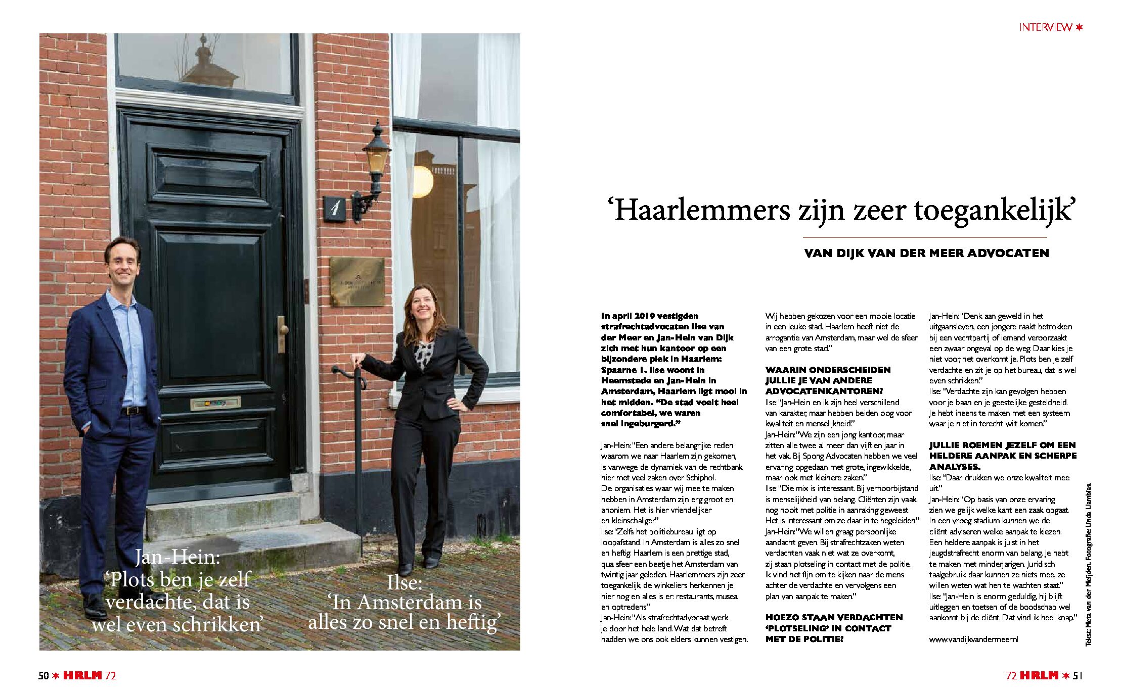 Bijna twee jaar geleden vestigden strafrechtadvocaten Ilse van der Meer en Jan-Hein van Dijk zich met hun kantoor in Haarlem. Dit vanwege de dynamiek van de rechtbank met veel zaken over Schiphol, maar ook om het prettige karakter van de stad. Ze zijn een jong kantoor, maar zitten alle twee al meer dan vijftien jaar in het vak. Bij Spong Advocaten in Amsterdam hebben ze veel ervaring opgedaan. “VanDijkvanderMeer Advocaten staat voor een heldere aanpak en scherpe analyse”, vertelt Ilse van der Meer aan TEXTSTUDIO. “Op basis van onze ervaring zien we gelijk welke kant een zaak opgaat. In een vroeg stadium kunnen we de cliënt adviseren welke aanpak te kiezen. Oog voor kwaliteit en menselijkheid is hierbij van belang.” Het interview is gepubliceerd in de HRLM Haarlemse Stadsglossy. (Foto: Linda Llambias)