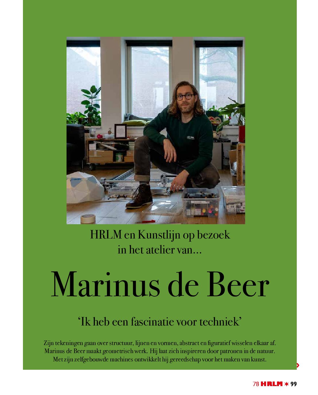 Marinus de Beer woont en werkt in een bovenwoning in de Haarlemse wijk Rozenprieel. Zijn woonkamer oogt rommelig en opgeruimd tegelijk. De vloer is leeg, maar de wandkasten puilen uit met boeken, tekenmappen en objecten. Midden in de kamer op de eettafel staat een computer, een tekenmachine en daaromheen zelfgemaakte studiolampen. Tijdens zijn studie aan de Rietveld Academie bouwde de kunstenaar machines waarmee je kunt 3D-printen en lasersnijden. In die tijd is zijn fascinatie ontstaan om zelf apparaten te bouwen, om de vormen te maken die hij nodig heeft voor een bepaald project. “Ik ontwikkel machines als instrument om kunst mee te maken.” Zijn tekeningen gaan over structuur, lijnen en vormen, abstract en figuratief wisselen elkaar af. Marinus maakt geometrisch werk en laat zich inspireren door het ritme in de natuur. “Ik ben gefascineerd door de Fibonacci-reeks, een opeenvolging van cijfers. Je begint bij nul en telt er steeds het vorige getal bij op.” TEXTSTUDIO nam hem een interview af voor HRLM Haarlemse Stadsglossy. (Foto’s: Christhilde Klein)