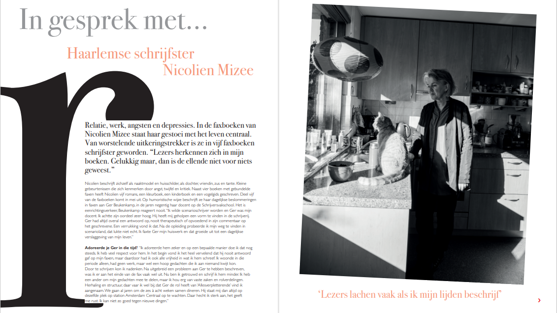 Nicolien Mizee beschrijft zichzelf als naaktmodel en huisschilder, als dochter, vriendin, zus en tante. Kleine gebeurtenissen die zich kenmerken door angst, twijfel en kritiek. In de faxboeken van Nicolien staat haar gestoei met het leven centraal. Werk, relaties, angsten en depressies, alles komt aan bod. Van worstelende uitkeringstrekker is ze in vijf faxboeken schrijfster geworden. “Lezers herkennen zich in mijn boeken. Gelukkig maar, dan is de ellende niet voor niets geweest.” Naast vier boeken met gebundelde faxen heeft Nicolien vijf romans, een kleurboek, een kinderboek en een vogelgids geschreven. Deel vijf van de faxboeken komt in mei uit. Op humoristische wijze beschrijft ze haar dagelijkse beslommeringen in faxen aan Ger Beukenkamp, in de jaren negentig haar docent op de Schrijversvakschool. Het is eenrichtingsverkeer, Beukenkamp reageert nooit. “Het is verschrikkelijk om al die faxen terug te lezen. Ik voel mij op het moment een totaal andere vrouw.” TEXTSTUDIO interviewde haar voor HRLM. (Foto’s: Linda Llambias)