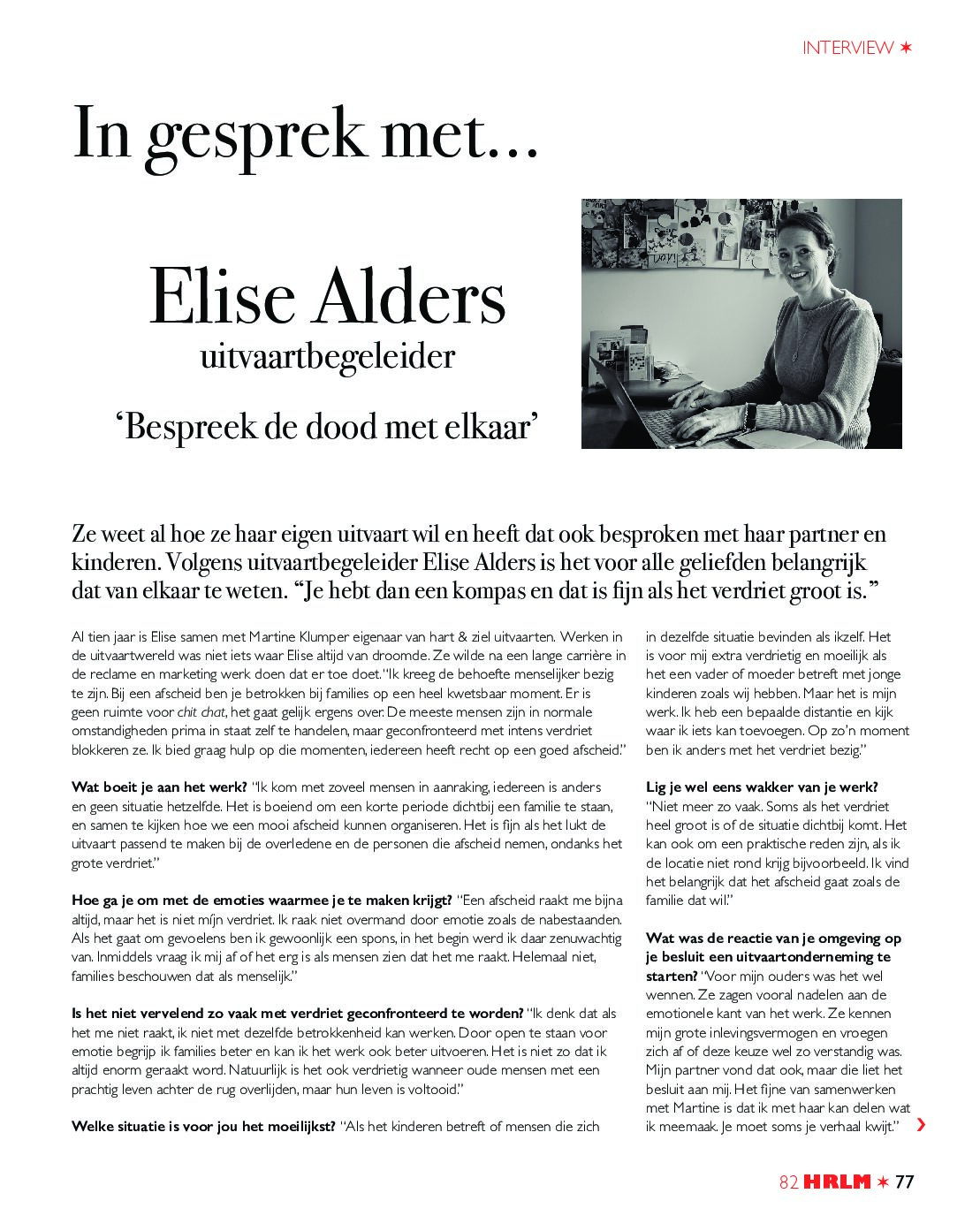 Al tien jaar is Elise Alders samen met Martine Klumper eigenaar van hart & ziel uitvaarten. Werken in de uitvaartwereld was niet iets waar ze altijd al van droomde. Elise wilde na een lange carrière in de reclame en marketing werk doen dat er toe doet. “Ik kreeg steeds meer de behoefte menselijker bezig te zijn. Bij een afscheid ben je betrokken bij families op een heel kwetsbaar moment. Er is geen ruimte voor chitchat, het gaat gelijk ergens over. De meeste mensen zijn in normale omstandigheden prima in staat om zelf te handelen, maar geconfronteerd met intens verdriet blokkeren ze.” Ze weet al hoe ze haar eigen uitvaart wil en heeft dat ook besproken met haar partner en kinderen. Elise hoopt op een afscheid met een lach en een traan. Volgens haar is het voor alle geliefden belangrijk dat van elkaar te weten. “Bespreek de dood met elkaar. Je hebt dan een kompas en dat is fijn als het verdriet groot is”, vertelt ze tijdens een interview met TEXTSTUDIO voor HRLM. (Foto’s: Christhilde Klein)